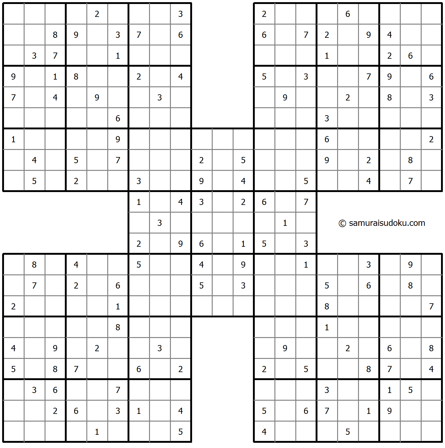 • 侍数独(合体―5)は数独変体の一種で、5つの数独から成り立っています。1つが中心に、それ以外の4つは一部が中心の数独の角と重なっています。1つの数独でそれぞれ答えを導き出すのではなく、5つの数独すべてが成り立つ唯一の答えを求めます。