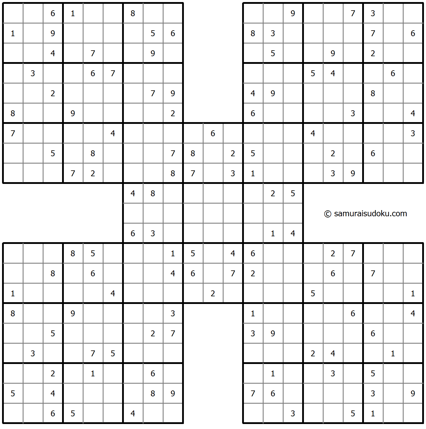 • 侍数独(合体―5)は数独変体の一種で、5つの数独から成り立っています。1つが中心に、それ以外の4つは一部が中心の数独の角と重なっています。1つの数独でそれぞれ答えを導き出すのではなく、5つの数独すべてが成り立つ唯一の答えを求めます。