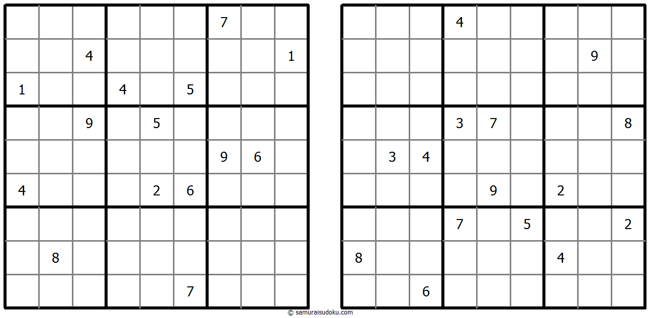 • 双対応数独は一対の一般的な数独から成り立っており、開始時点では各枠組みの中にいくつかの数字が記入されています。両方で完璧な解答を出すには、双子のそれぞれのパズルを解く必要がありますが、特定の数字が双方のパズルで同じところに当てはめられるという条件が満たされる必要があります。